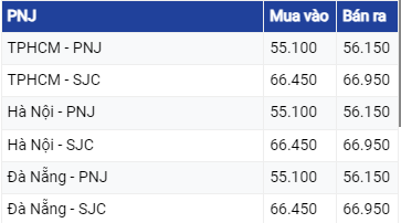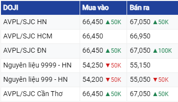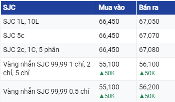 Trong đó, Công ty Vàng bạc Đá quý Sài Gòn và Tập đoàn Doji điều chỉnh giá vàng SJC đều tăng 50.000 đồng/lượng ở cả chiều mua vào và bán ra so với đầu phiên.