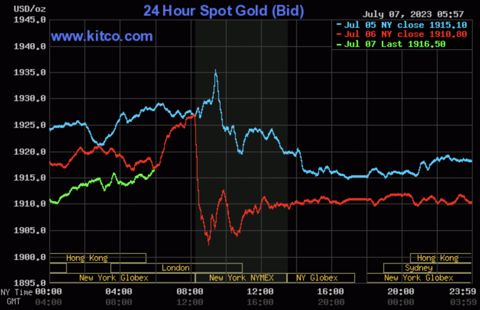 Trong phiên giao dịch chiều ngày 7/7, giá vàng giao ngay tăng 0,29% lên 1.916 USD/ounce vào lúc 16h58 (giờ Việt Nam), theo Kitco. Trong khi, giá vàng giao tháng 8 tăng 0,37% lên 1.922 USD/ounce.