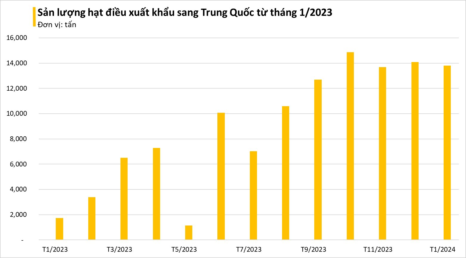 Đáng chú ý, Trung Quốc vẫn đang là thị trường nhập khẩu tích cực nhất trong những tháng qua. Cụ thể trong tháng 1/2024, xuất khẩu hạt điều sang Trung Quốc đạt 13.789, tương đương 78,3 triệu USD, tăng đột biến 698% về lượng và tăng 662% về kim ngạch so với cùng kỳ năm ngoái.