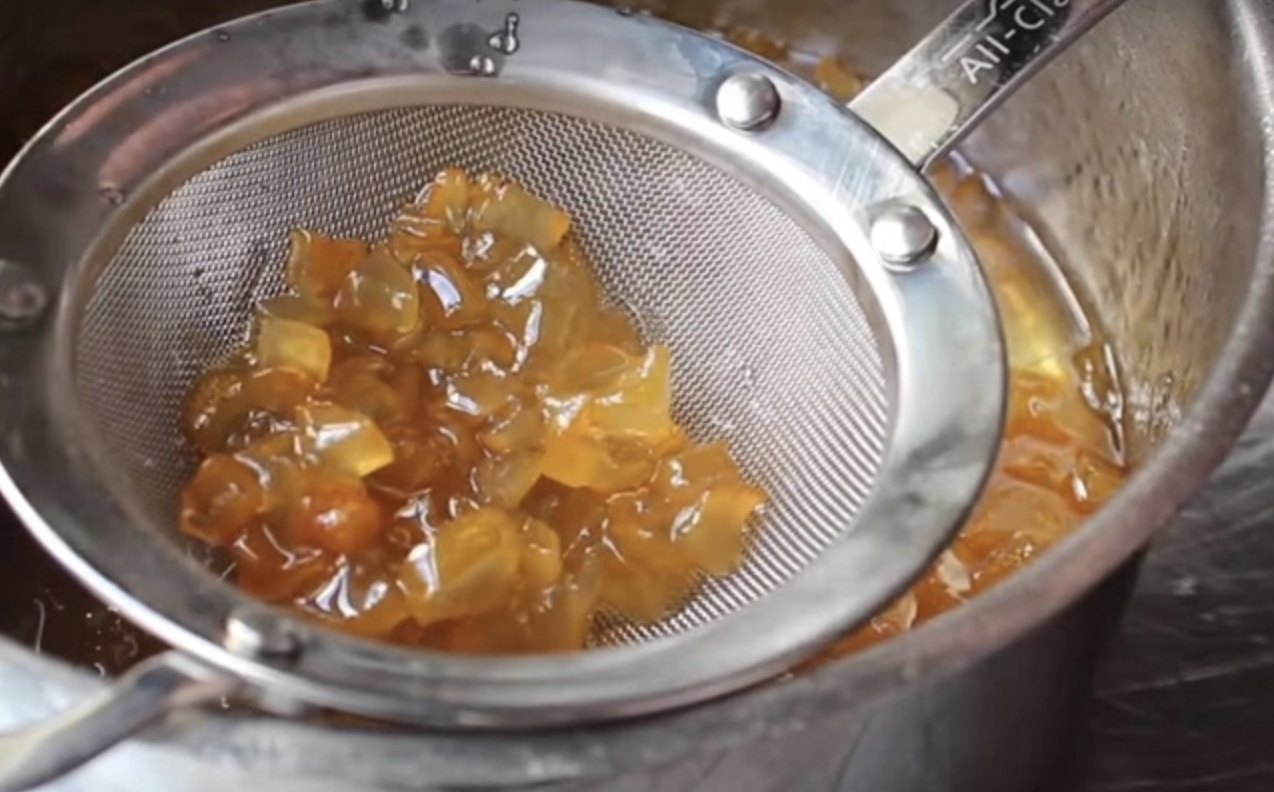 Bước 5: Vớt mứt ra rây để mứt nguội và rút bớt nước đường sau đó bảo quản trong lọ kín trong tủ lạnh ở ngăn mát.