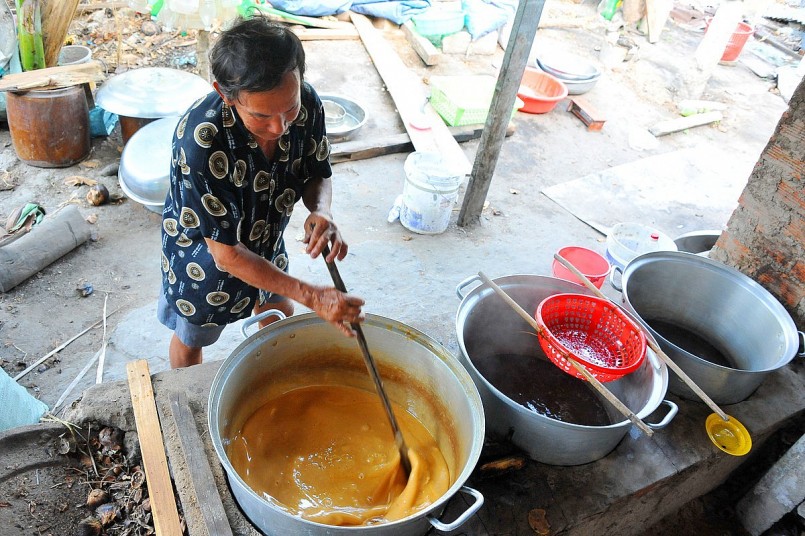 | Sau khi lấy nước từ hoa đực của cây thốt nốt người dân sẽ nấu cho cô đặc thành đường |