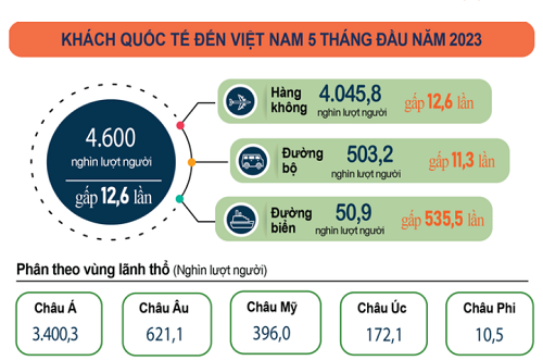Báo cáo tình hình kinh tế xã hội tháng 5 và 5 tháng đầu năm 2023 do Tổng cục Thống kê công bố sáng 29/5 cho biết, khách quốc tế đến Việt Nam tháng 5/2023 giảm 6,9% so với tháng trước. Tính chung 5 tháng của năm 2023, khách quốc tế đến nước ta ước đạt gần 4,6 triệu lượt người, gấp 12,6 lần cùng kỳ năm trước.