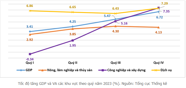 Báo cáo mới đây của Tổng cục Thống kê về tình hình kinh tế - xã hội cho biết, tổng sản phẩm trong nước (GDP) quý 4/2023 ước tính tăng 6,72% so với cùng kỳ năm trước, cao hơn quý 4 các năm 2012-2013 và 2020-2022 và với xu hướng tích cực, quý sau cao hơn quý trước (quý 1 tăng 3,41%, quý 2 tăng 4,25%, quý 3 tăng 5,47%).