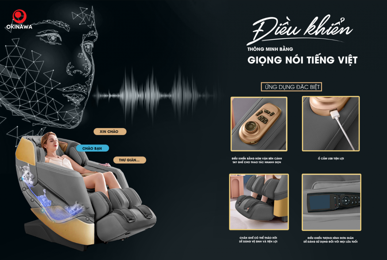 Điểm nổi bật nhất của ghế đó là chức năng điều khiển cầm tay hiện đại và điều khiển bằng giọng nói thông minh, tiện dụng cho mọi gia đình. Bạn chỉ cần tương tác với chiếc ghế bằng giọng nói thông qua những câu lệnh đơn giản, chiếc ghế sẽ tự động thực hiện những yêu cầu của bạn một cách chính xác nhất. Không cần dùng đến bảng điều khiển, người dùng vẫn có thể chọn chế độ, chức năng, kiểu massage theo ý muốn của mình.