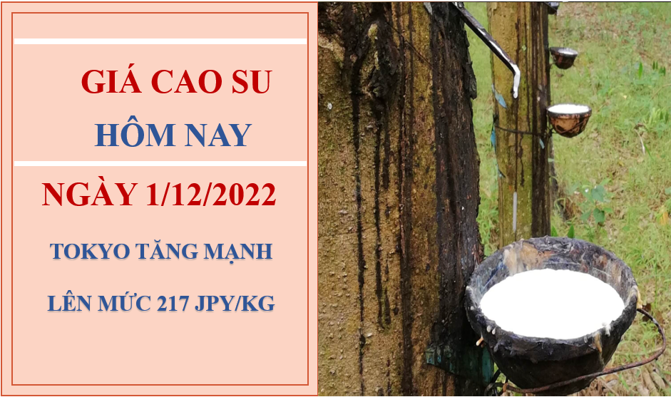 Tại Sở giao dịch hàng hóa Tokyo, giá cao su ngày 1/12/2022, lúc 13h00, kỳ hạn tháng 12/2022, tăng lên mức 217 JPY/kg, tăng mạnh 1,4 yên, tương đương 0,65%.