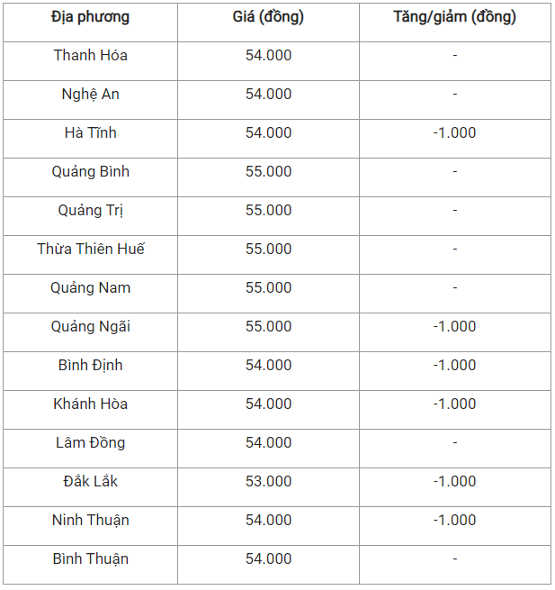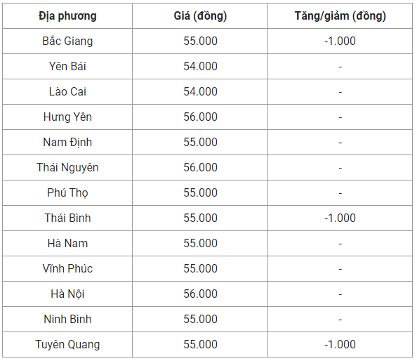 Sau khi giảm 1.000 đồng/kg, tỉnh Quảng Ngãi giao dịch ở mức 55.000 đồng/kg.