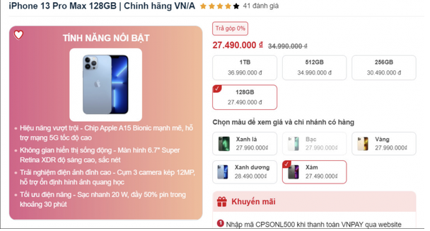 • iPhone 13 Pro Max – 128GB: 27.490.000 đồng, giảm 7,5 triệu so với giá niêm yết