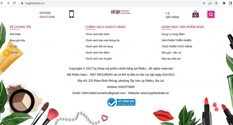 Qua kiểm tra website thương mại điện tử bán hàng có địa chỉ trên Internet (https://myphamhalo.vn/). So sánh đối chiếu với Hệ thống quản lý hoạt động thương mại điện tử do Bộ Công Thương quản lý, thông tin của Website thương mại điện tử bán hàng https://myphamhalo.vn/ thuộc quyền sở hữu của cá nhân và có địa chỉ hoạt động tại 166 Quyết Tiến, P. Iakring, Tp. Pleiku, Gia Lai.