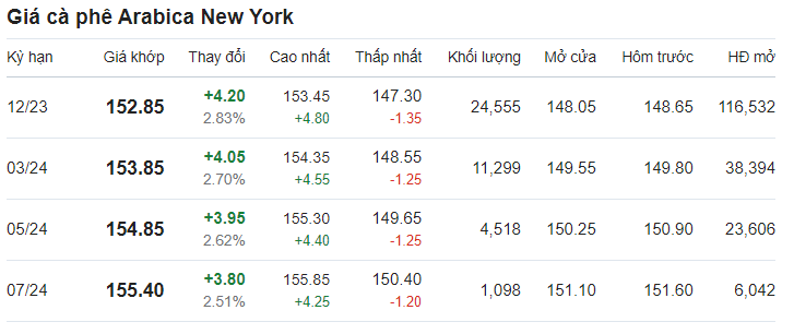 Giá cà phê arabica giao tháng 12/2023 tại New York ở mức 152,85 US cent/pound sau khi tăng 2,83% (tương đương 4,2 US cent) tại thời điểm khảo sát vào lúc 6h20 (giờ Việt Nam).