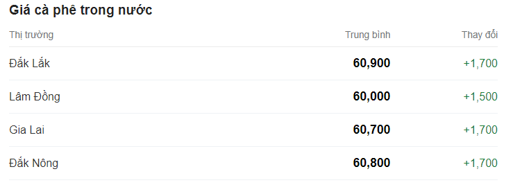 Theo đó, tỉnh Lâm Đồng có giá thấp nhất là 60.000 đồng/kg. Kế đến là tỉnh Gia Lai với 60.700 đồng/kg.