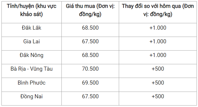 Cụ thể, Gia Lai và Đồng Nai lần lượt tăng 1.000 đồng/kg và 500 đồng/kg lên cùng mức là 67.500 đồng/kg.