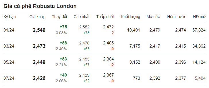 Theo ghi nhận, giá cà phê trên thị trường thế giới tăng. Theo đó, giá cà phê trực tuyến robusta tại London giao tháng 1/2024 được ghi nhận tại mức 2.549 USD/tấn sau khi tăng 3,03% (tương đương 75 USD).