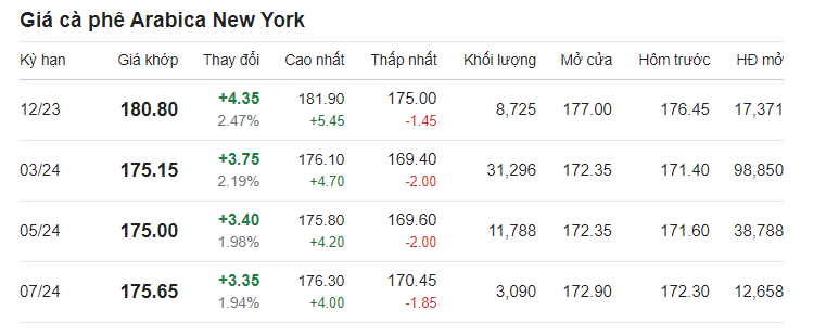 Trên sàn giao dịch New York, ngày 9/11/2023, giá cà phê arabica giao kỳ hạn tháng 12/2023, tháng 3/2024, tháng 5/2024 và tháng 7/2024 tăng lần lượt 8,3%, 7,2%, 6,9% và 6,7% so với cuối tháng 10/2023, lên mức 174,35 US cent/lb; 172,1 US cent/lb; 172,2 US cent/lb và 172,85 US cent/lb.