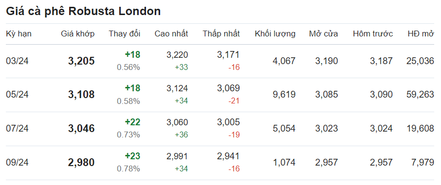 Theo ghi nhận, giá cà phê trên thị trường thế giới tăng. Theo đó, giá cà phê trực tuyến robusta tại London giao tháng 3/2024 được ghi nhận tại mức 3.205 USD/tấn sau khi tăng 0,56% (tương đương 18 USD).