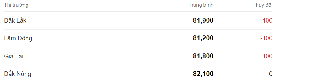 Theo đó, tỉnh Lâm Đồng có giá thấp nhất là 81.200 đồng/kg. Kế đến là tỉnh Gia Lai với 81.800 đồng/kg.