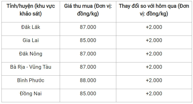Hiện tại, hai tỉnh Đồng Nai và Gia Lai đang ghi nhận cùng mức giá là 85.000 đồng/kg. Đây cũng là mức giá thấp nhất được ghi nhận trong các địa phương.
