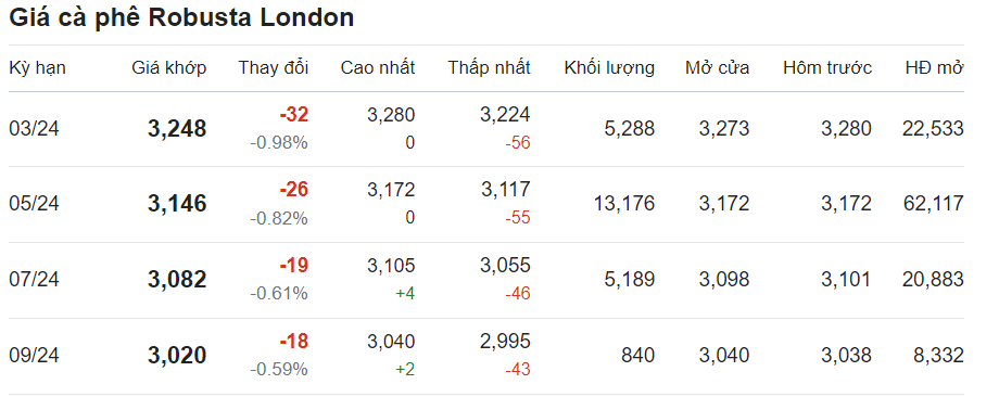 Theo ghi nhận, giá cà phê trên thị trường thế giới tăng - giảm trái chiều. Theo đó, giá cà phê trực tuyến robusta tại London giao tháng 3/2024 được ghi nhận tại mức 3.249 USD/tấn sau khi giảm 0,95% (tương đương 31 USD).