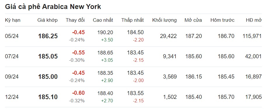 Giá cà phê arabica giao tháng 3/2024 tại New York ở mức 191,05 US cent/pound sau khi tăng 0,1% (tương đương 0,2 US cent) tại thời điểm khảo sát vào lúc 6h (giờ Việt Nam).