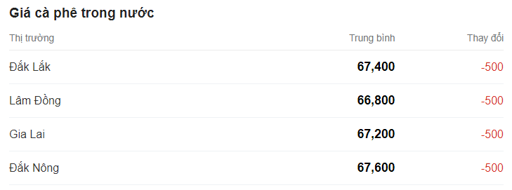 Theo đó, tỉnh Lâm Đồng có giá thấp nhất là 66.800 đồng/kg. Kế đến là tỉnh Gia Lai với 67.200 đồng/kg.
