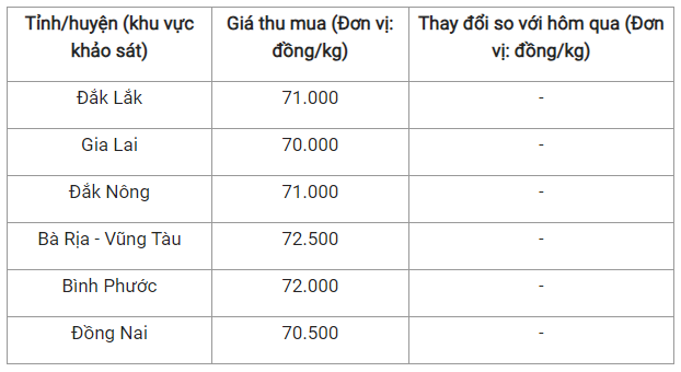 Chi tiết như sau, tỉnh Gia Lai có mức giá thu mua là 70.000 đồng/kg và Đồng Nai đang niêm yết giá ở mức 70.500 đồng/kg.