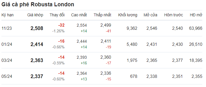 Theo ghi nhận, giá cà phê trên thị trường thế giới giảm. Cụ thể, giá cà phê trực tuyến robusta tại London giao tháng 11/2023 được ghi nhận tại mức 2.508 USD/tấn sau khi giảm 1,26% (tương đương 32 USD).