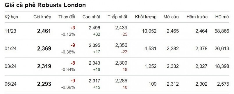 Theo ghi nhận, giá cà phê trên thị trường thế giới giảm. Cụ thể, giá cà phê trực tuyến robusta tại London giao tháng 11/2023 được ghi nhận tại mức 2.461 USD/tấn sau khi giảm 0,12% (tương đương 3 USD).