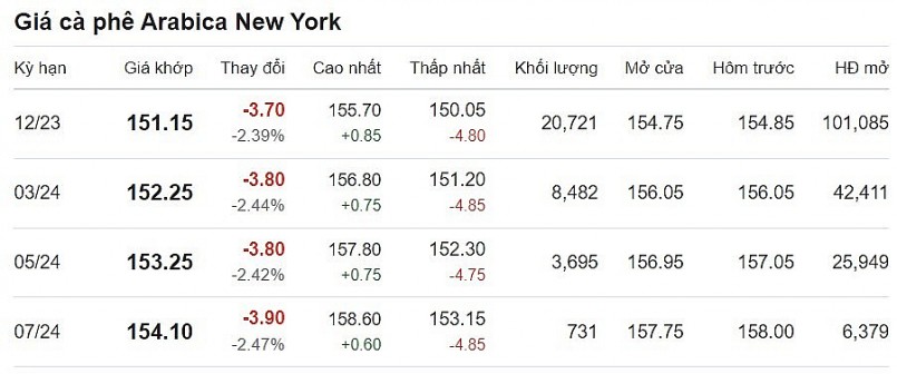 Giá cà phê arabica giao tháng 12/2023 tại New York ở mức 151,15 US cent/pound sau khi giảm 2,39% (tương đương 3,7 US cent) tại thời điểm khảo sát vào lúc 7h10 (giờ Việt Nam).