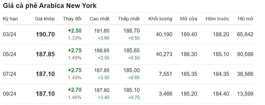 Giá cà phê arabica giao tháng 3/2024 tại New York ở mức 190,35 US cent/pound sau khi tăng 1,14% (tương đương 2,15 US cent) tại thời điểm khảo sát vào lúc 6h (giờ Việt Nam).