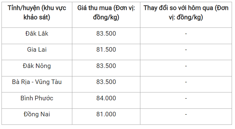 Cụ thể, hai tỉnh Đồng Nai và Gia Lai lần lượt ghi nhận mức giá 81.000 đồng/kg và 81.500 đồng/kg.
