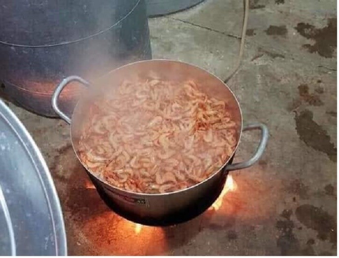 | Luộc chín tôm trước khi phơi khô. |
