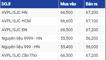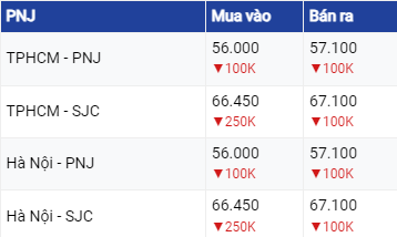 Vàng SJC ở khu vực Hà Nội và Đà Nẵng đang mua vào mức 66,5 triệu đồng/lượng và bán ra mức 67,02 triệu đồng/lượng. Tại TP Hồ Chí Minh, vàng SJC đang mua vào cao hơn 100.000 đồng so với khu vực Hà Nội và Đà Nẵng nhưng bán ra thấp hơn 100.000 đồng. Như vậy, so với rạng sáng ngày trước đó, giá vàng SJC đã được điều chỉnh giảm 150.000 đồng ở cả 2 chiều.
