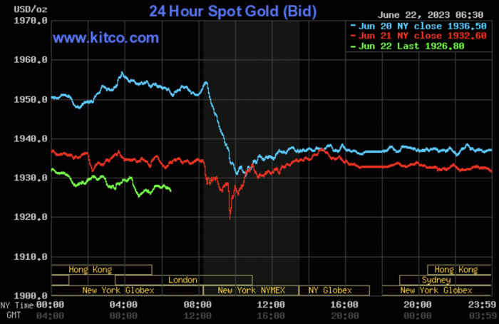 Trong phiên giao dịch chiều ngày 22/6, giá vàng giao ngay giảm 0,30% xuống 1.926 USD/ounce vào lúc 16h32 (giờ Việt Nam), theo Kitco. Trong khi, giá vàng giao tháng 8 giảm 0,38% xuống 1.937 USD/ounce.
