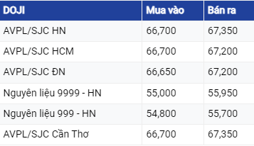 Giá vàng 9999 hôm nay được DOJI được niêm yết ở mức 66,70 triệu đồng/lượng mua vào và 67,35 triệu đồng/lượng bán ra.