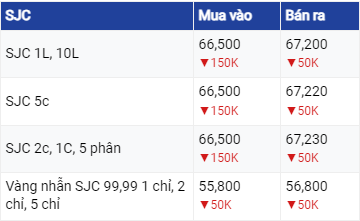 Tại Công ty Vàng bạc Đá quý Sài Gòn, giá vàng SJC có mức giảm nhiều nhất 150.000 đồng/lượng ở chiều mua vào và giảm 50.000 đồng ở chiều bán ra, niêm yết ở mức 66,50 triệu đồng/lượng mua vào và 67,20 triệu đồng/lượng bán ra.