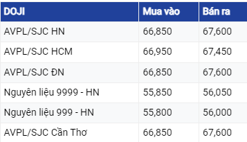 Cùng thời điểm, Tập đoàn DOJI niêm yết giá vàng mua vào - bán ra ở mức 66,85 - 67,60 triệu đồng/lượng. So với chốt phiên giao dịch ngày 16/8/2023, giá vàng mua vào và bán ra tại DOJI tiếp tục giảm 50.000 đồng/lượng ở cả chiều mua và bán ra. Chênh lệch giá mua - bán vàng tại DOJI đang duy trì ở mức 750.000 đồng/lượng.
