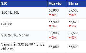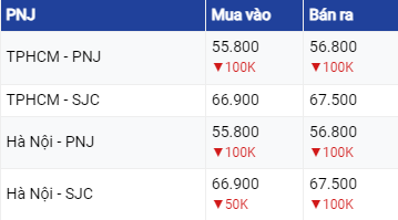 Giá vàng PNJ ở khu vực Hà nội và TP Hồ Chí Minh niêm yết ở mức 66,90 triệu đồng/lượng mua vào và 67,5 triệu đồng/lượng bán ra, giảm 50.000 đồng ở chiều mua và giảm 100.000 đồng/ lượng ở chiều bán so với rạng sáng trước đó.