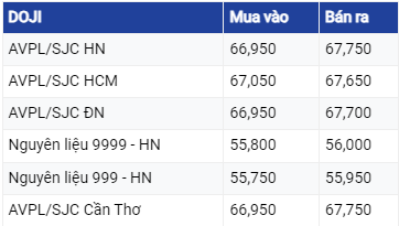 Giá vàng 9999 hôm nay được DOJI được niêm yết ở mức 66,95 triệu đồng/lượng mua vào và 67,75 triệu đồng/lượng bán ra.