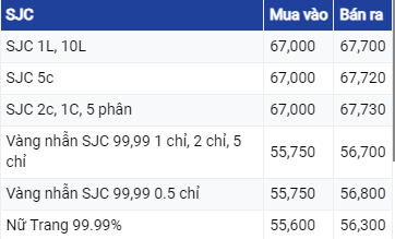 Giá vàng SJC ở khu vực Hà Nội và Đà Nẵng niêm yết ở mức 67 triệu đồng/lượng mua vào và 67,72 triệu đồng/lượng bán ra. Tại TP Hồ Chí Minh, vàng SJC vẫn đang mua vào mức tương tự như ở khu vực Hà Nội và Đà Nẵng nhưng bán ra thấp hơn 20.000 đồng.