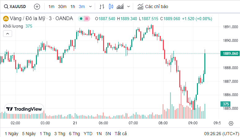 Giá vàng quốc tế (XAU) hôm nay là 1,889.52 USD (cập nhật lúc 09:25:38 21/08/2023).