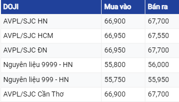 Giá vàng DOJI tại khu vực Hà Nội được niêm yết ở mức 66,9 triệu đồng/lượng mua vào và 67,7 triệu đồng/lượng bán ra. Tại TP Hồ Chí Minh, vàng thương hiệu này đang mua vào cao hơn 50.000 đồng nhưng bán ra mức thấp hơn 150.000 đồng so với khu vực Hà Nội.
