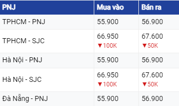 Giá vàng SJC ở khu vực Hà Nội và Đà Nẵng niêm yết ở mức 66,95 triệu đồng/lượng mua vào và 67,57 triệu đồng/lượng bán ra. Tại TP Hồ Chí Minh, vàng SJC vẫn đang mua vào mức tương tự như ở khu vực Hà Nội và Đà Nẵng nhưng bán ra thấp hơn 20.000 đồng. Như vậy, so với rạng sáng trước đó, giá vàng SJC đã được điều chỉnh giảm 150.000 đồng.