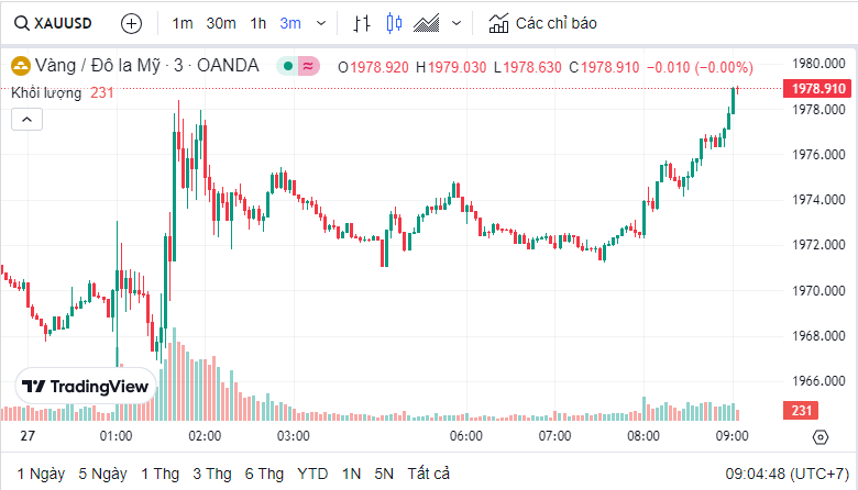 Giá vàng quốc tế (XAU) hôm nay là 1,978.60 USD (cập nhật lúc 09:03:37 27/07/2023).