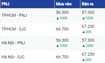 Giá vàng PNJ niêm yết ở mức 66,70 triệu đồng/lượng mua vào và 67,25 triệu đồng/lượng bán ra. Giữ nguyên ở chiều mua vào, tăng 50.000 đồng/lượng ở chiều bán ra so với rạng sáng trước đó.