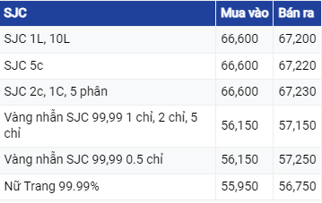 Trong khi đó, giá vàng tại SJC được niêm yết ở mức 66,6 - 67,2 triệu đồng/lượng (mua - bán), giảm 50.000 đồng/lượng với cùng thời điểm hôm qua.