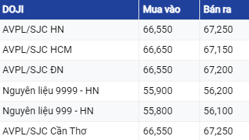 Giá vàng tại Tập đoàn DOJI niêm yết giá vàng mua vào - bán ra ở mức 66,55 - 67,25 triệu đồng/lượng. So với đóng cửa phiên giao dịch ngày 29/7/2023, giá vàng mua vào và bán ra tại DOJI không có thay đổi. Chênh lệch giá mua - bán vàng tại DOJI đang duy trì ở mức 700.000 đồng/lượng.