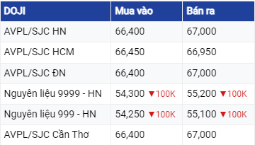 Giá vàng 9999 được DOJI được niêm yết ở mức 66,40 triệu đồng/lượng mua vào và 67,00 triệu đồng/lượng bán ra.