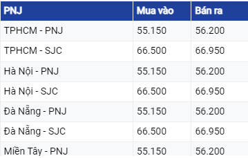 Còn tại hệ thống PNJ, thời điểm khảo sát niêm yết giá vàng SJC ở mức 66,50 – 66,95 triệu đồng/lượng (mua vào - bán ra).
