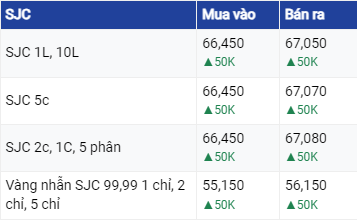 Tại thời điểm khảo sát lúc 10h00 ngày 4/7/2023, trên sàn giao dịch của Công ty Vàng bạc đá quý Sài Gòn SJC, vàng SJC đang là 66,40 triệu đồng/lượng mua vào và 67,00 triệu đồng/lượng bán ra.