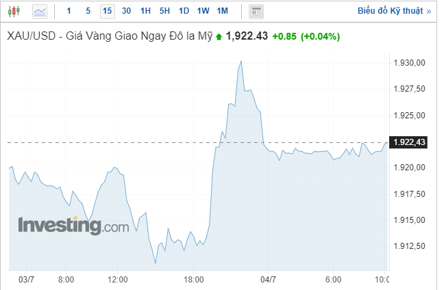 Sáng ngày 4/7, giá vàng thế giới trên sàn Kitco tại 1.921,8 – 1.922,8 USD/ounce, tăng 2 USD/ounce so với phiên giao dịch trước đó.
