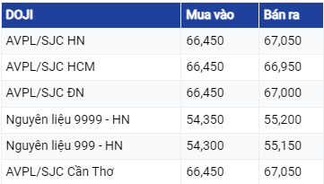 Giá vàng DOJI tại Hà Nội được niêm yết ở mức 66,45 triệu đồng/lượng mua vào và 67,05 triệu đồng/lượng bán ra. Tại TP Hồ Chí Minh giá vàng mua vào với mức tương tự nhưng bán ra thấp hơn 100.000 nghìn đồng/ lượng.